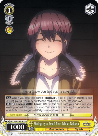 [AUTO] When you use this card's"Backup", if all of your characters are "Quintuplets", you may put the top card of your deck into your stock. [ACT] [COUNTER] Backup 2000, Level 1 [(1) Put this card from your hand into your waiting room] (Choose 1 of your characters that is being frontal attacked, and that character gets +2000 power until end of turn)