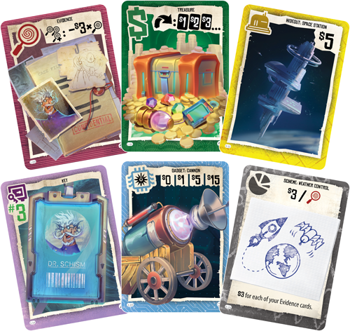 Each round, every player gets a hand of five cards that they’ll need to split with their neighbor, representing some of Dr. Schism’s assets. It could be Treasure, Gadgets, the deeds to Hideouts, or even Evidence of his misdeeds! You’ll decide how to split the 5 cards, but split them wisely, as your neighbor will choose who gets which pile! Will you tempt them with the Gadget they’re collecting, hoping they’ll take some damning Evidence with it? Will you offer them 4 of the 5 cards, pushing them to leave you with the one item you really need?