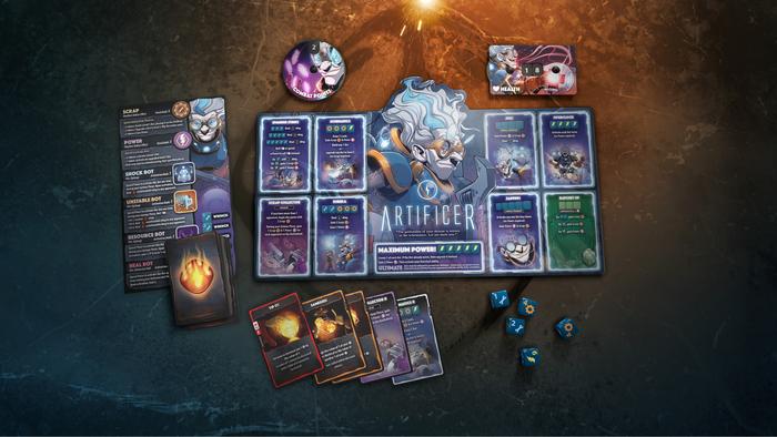 It's a fast-paced 2-6 player combat game (1v1, 2v2, 3v3, 2v2v2, or free-for-all). Select from a variety of heroes that play and feel completely distinct from one another. Attack opponents and activate abilities by rolling your hero's unique set of five dice. Accumulate combat points and spend them on cards that have a large range of effects, such as granting permanent hero upgrades, applying status effects, and manipulating dice directly (yours, your teammate's, or even your opponent's).