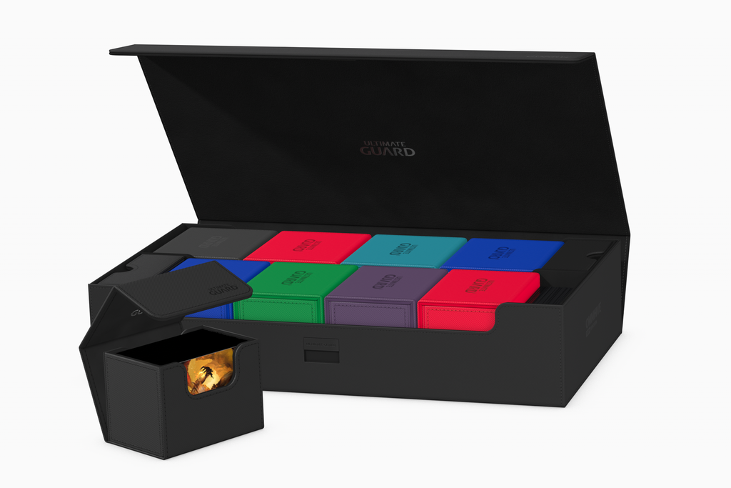 The ultimate spacious and flexible box for storing large collections. This box can hold more than 1000  double-sleeved cards or carry multiple decks and/or Play-Mats plus other Ultimate Guard products like the Sidewinder 133+. Two removable, magnetic, adjustable and stackable trays make this box unique: it’s adaptable for all kinds of games and formats and enables multiple different ways of storing and using your collection.