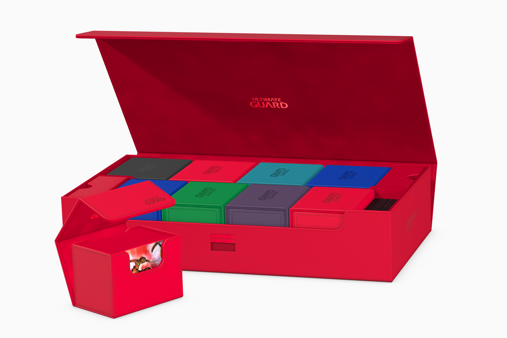 The ultimate spacious and flexible box for storing large collections. This box can hold more than 1000  double-sleeved cards or carry multiple decks and/or Play-Mats plus other Ultimate Guard products like the Sidewinder 133+. Two removable, magnetic, adjustable and stackable trays make this box unique: it’s adaptable for all kinds of games and formats and enables multiple different ways of storing and using your collection.