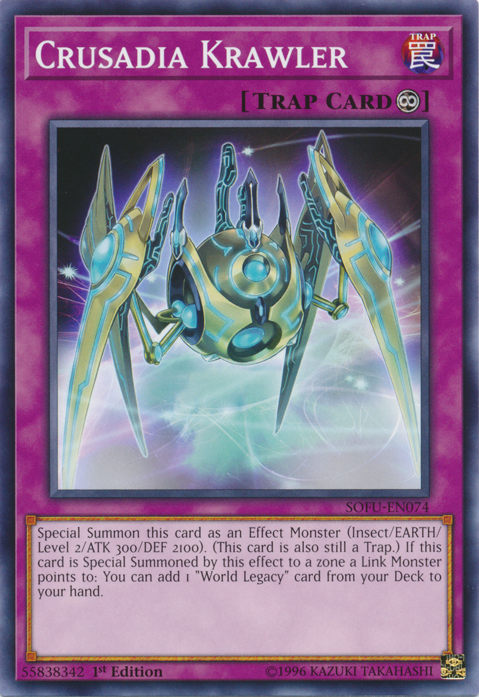Special Summon this card as an Effect Monster (Insect/EARTH/Level 2/ATK 300/DEF 2100). (This card is also still a Trap.) If this card is Special Summoned by this effect to a zone a Link Monster points to: You can add 1 "World Legacy" card from your Deck to your hand.