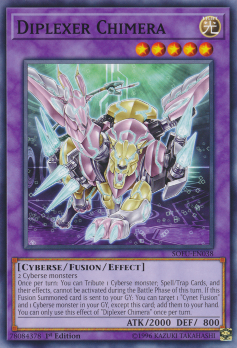 2 Cyberse monsters Once per turn: You can Tribute 1 Cyberse monster you control; Spell/Trap Cards, and their effects cannot be activate during battle Phase of this turn. If this Fusion Summoned card is sent to your GY: You can target 1 "Cynet Fusion" and 1 Cyberse monster in your GY, except this card; add them to your hand. You can only use this effect of “Diplexer Chimera” once per turn.