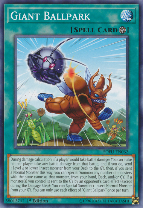 During damage calculation, If a player would take battle damage: You can make neither player take any battle damage from that battle, and if you do, send 1 Level 4 or lower Insect monster from your deck to the GY, then, if you sent a Normal Monster this way, you can Special Summon any number of monster with the same name as that monster, from you hand, Deck, and/or GY. If a monster(s) you control is sent to the GY by an opponent's card effect(Except during the Damage Step): You can Special Summon 1 Insect Normal Monster from you GY. You can only use each effect of "Giant Ballpark" once per turn.