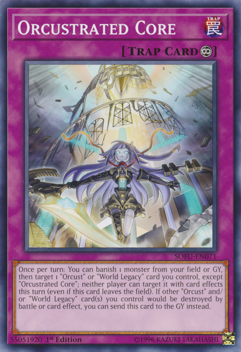 Once per turn: You can banish 1 monster from your field or GY, then target 1 “Orcust” or “World Legacy” card you control, except “Orcustrated Core”; neither player can target it with card effects this turn (even if this card leaves the field). If other “Orcust” and/or “World Legacy” card(s) you control would be destroyed by battle or card effect, you can send this card to the GY instead.