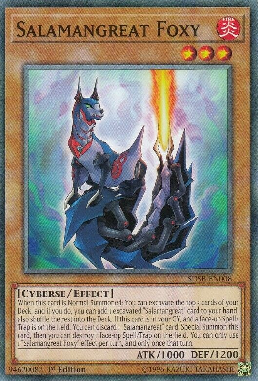 When this card is Normal Summoned: You can excavate the top 3 cards of your Deck, and if you do, you can add 1 excavated "Salamangreat" card to your hand, also shuffle the rest into the Deck. If this card is in your GY, and a face-up Spell/Trap is on the field: You can discard 1 "Salamangreat" card; Special Summon this card, then you can destroy 1 face-up Spell/Trap on the field. You can only use 1 "Salamangreat Foxy" effect per turn, and only once that turn.