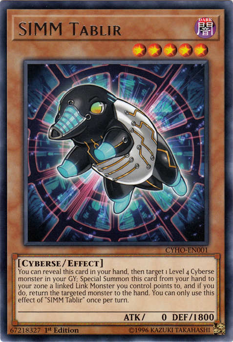 You can reveal this card in your hand, then target 1 Level 4 Cyberse monster in your GY; Special Summon this card from your hand to your zone a linked Link Monster you control points to, and if you do, return the targeted monster to the hand. You can only use this effect of "SIMM Tablir" once per turn.