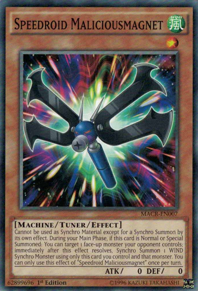 Cannot be used as Synchro Material except for a Synchro Summon by its own effect. During your Main Phase, if this card is Normal or Special Summoned: You can target 1 face-up monster your opponent controls; immediately after this effect resolves, Synchro Summon 1 WIND Synchro Monster using only this card you control and that monster. You can only use this effect of "Speedroid Maliciousmagnet" once per turn.