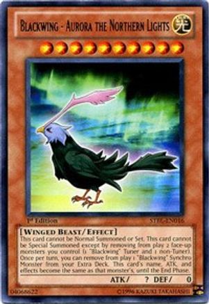 This card cannot be Normal Summoned or Set. This card cannot be Special Summoned except by removing from play 2 face-up monsters you control (1 "Blackwing" Tuner and 1 non-Tuner). Once per turn, you can remove from play 1 "Blackwing" Synchro Monster from your Extra Deck. This card's name, ATK, and effects become the same as that monster's, until the End Phase.