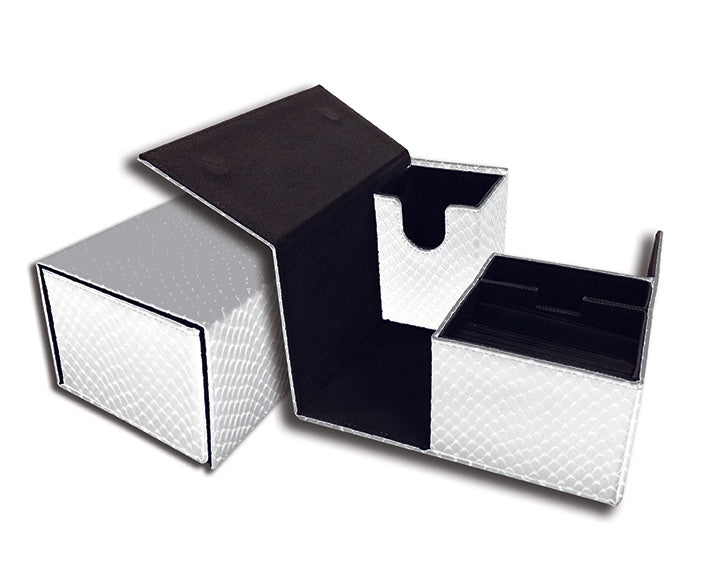 Vinyl deckbox that holds up to 100 double sleeved cards. Features an additional slot for tokens, dice, etc. Strong magnet holds the box top firmly closed to keep your cards protected!