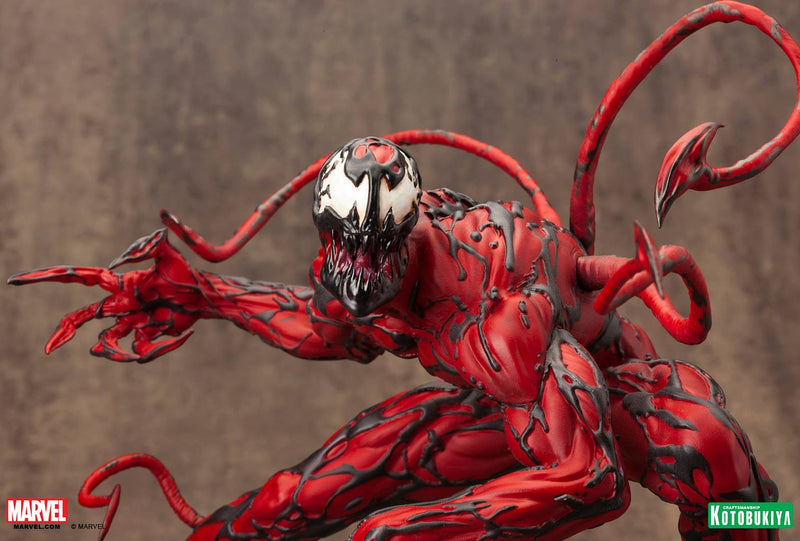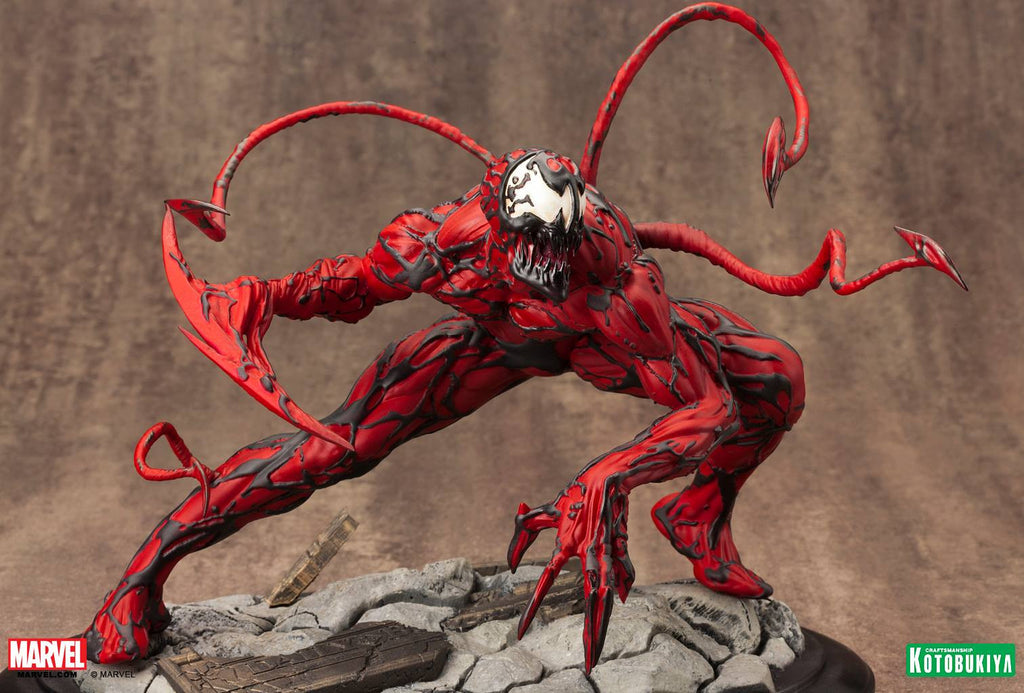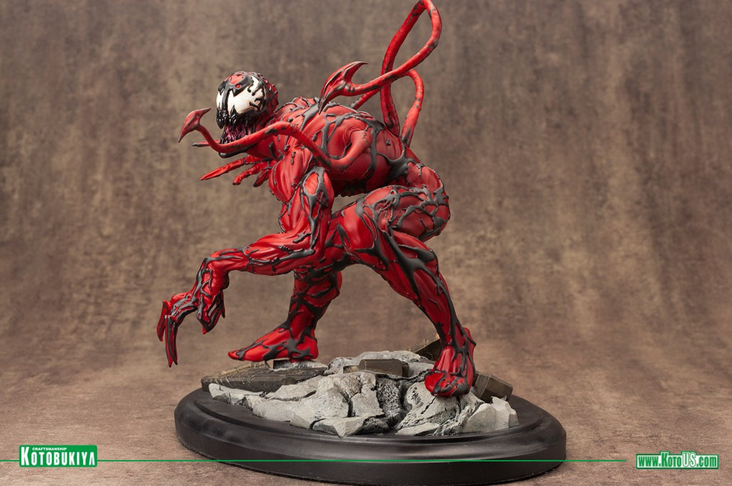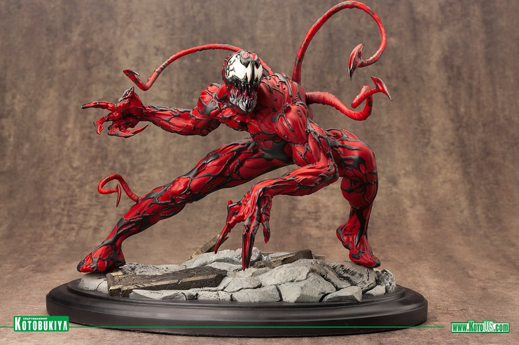 - Carnage looks great on his own and even better alongside other Fine Art Statues from Kotobukiya such as Spider-Man and Venom!
